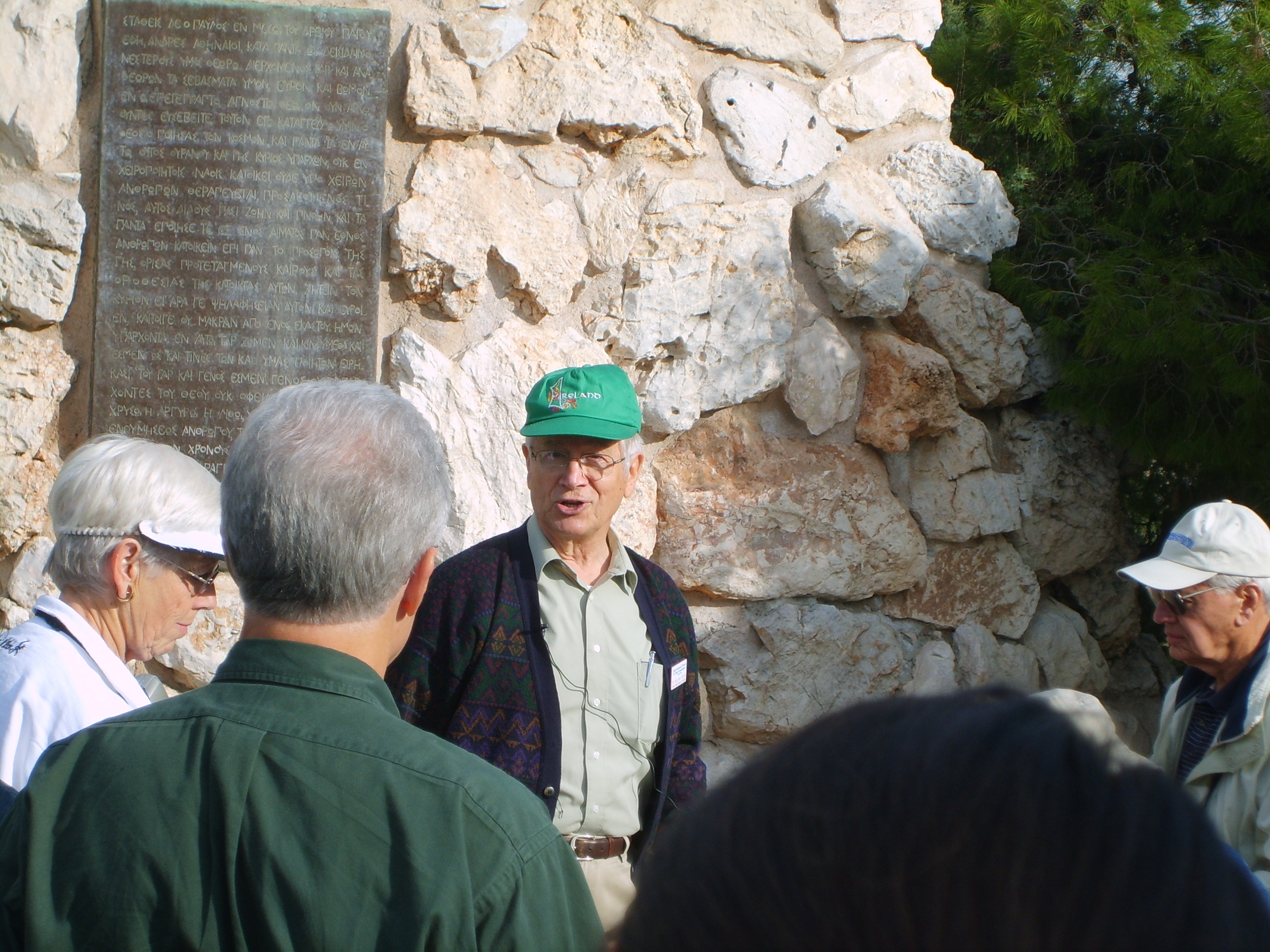 Some of the audio files also include recordings of Dr. William Tolar (more on his credentials later), interspersed throughout. He is equally interesting, considering he is a retired professor of Biblical Backgrounds from Southwestern Baptist Theological Seminary. In the image above, Dr. Tolar is standing at the foot of the Areopagus in Greece, the site where Paul preached the famous sermon about the “Unknown God” of the Athenians (Acts 17:16-34). The Greek text of Paul’s sermon is inscribed on the plaque over Dr. Tolar’s shoulder.