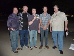 The Debate Spectators (L-R): Victor "I love you, man!" Loredo, Mike Bangs (great last name for a barber, right?), Daniel "Deep Ellum" Garlow (nephew of notorious Dominionist, Jim Garlow, but that's another post), John Brian "J.B." Chitty (lead singer of Denton Drive--click the pic to hear his "Upbeat Thrash Punk"--he says it's positive stuff), and your humble blogger who really needs to stand in back in future group photos.