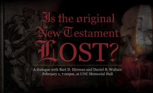 Now they plan to meet on Ehrman’s turf to “dialogue” (as opposed to debate? Is this just postmodern euphamism?) on whether the original New Testament was lost. I suspect my summary of their positions above will be at the heart of this dialogue. Wish I could attend, but, then, it gets old hearing the same jokes out of both fellows. Hopefully they come up with fresh material. More on this in a few weeks after the debate is made available to those of us unable to attend. (Click for more info)